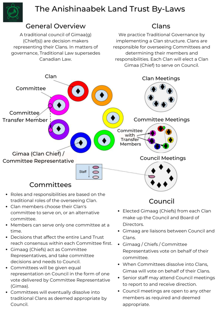 To further our actions of restoring our culture and identities, the Anishinaabek Land Trust aims to revitalize traditional Anishinaabe governance. This structure that we have implemented is at a very preliminary stage. Our vision with this structure is for it to grow, and advance into more specific, define roles that reflect and honour Traditional Governance that was used once before. To learn more about how we have implemented some of these ancient practices refer to the illustration below.